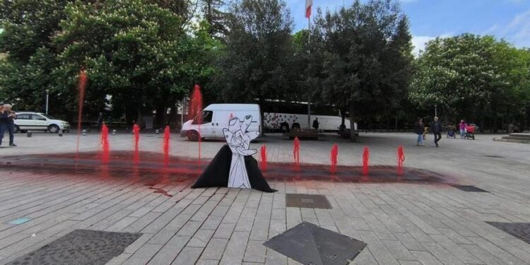 Hoy, 23 de abril, la fuente de la plaza de la catedral de Vitoria-Gasteiz se ha teñido de un color rojo vivo. No se trata de un hecho aislado, ya que esta mañana la fuente de la plaza Moyua de Bilbao también ha aparecido en el mismo color.